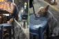 やせ細った犬が空腹に耐えきれず、屋台の椅子に顔を乗せ、人間が食べ物を分けてくれるのを待ち続ける(メキシコ)