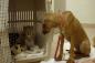 チーターの足の治療中、手術室の中でやさしく見守る犬