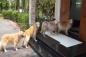 訓練された犬は一列に並び、足を拭く順番を待つ