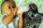 ダイナミック子育て!人間の赤ちゃんとジャガーの赤ちゃんが寄り添ってミルクをちゅうちゅう
