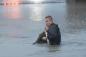 水没した車から被災者を助けるしインタビューもするレポーター(アメリカ)
