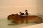 ボクじっとしていますから、みんな仲良く遊んでいてね!カピバラとアヒルのヒナたちのまったりお風呂ライフ