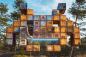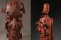 伝統文化と現代文明の融合。木材の彫像をピクセル処理したアート作品