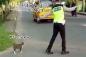 猫を誘導し道路を安全に渡らせる警察官と誘導される猫
