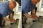 両手で水道から水をすくい、野良猫に水を飲ませる心優しき男性