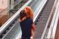 こわい。こわい。エスカレーター怖い。エスカレーターに尻込みする犬、飼い主さんに抱っこしてもらう。
