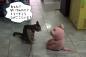 何このフワフワ毛玉~!大きな犬、はじめて小さきものとご対面。おっかなびっくり逃げ回る!