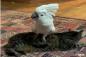 すごく・・・シュールです。猫の上に乗りながら犬の鳴き声で鳴くタイハクオウム