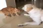 瞬間、肉球重ねて...犬の脚にかじりつく猫だったが、ワンと怒られ直ぐに謝罪