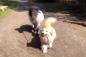 「お散歩行こ!」ポニーの手綱を引っ張って、一緒にお散歩するゴールデンレトリバー
