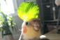 癒され度マキシマム。葉っぱの帽子を被り、声高らかに歌う幸せのオカメインコ