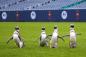 ペンギンたちの遠足。アメリカンフットボールのスタジアムを走り回る(アメリカ)