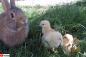 うさぎとヒヨコが仲良く木陰でくつろぎ、猫たちも登場するファンタジーな光景