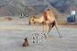 子犬が遊んでほしそうにラクダに近づいてきた。子犬を受け入れやさしくキスをするラクダ