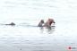 ママの背中のタクシーだ!ヒグマの子、お母さんの背中にちゃっかり乗って川を渡る