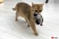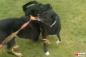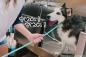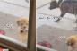 お家に入れない子犬に犬用ドアの使い方を教える大型犬