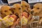 こんな動画だけ見ていたい。ゴールデンレトリバー、初めての赤ちゃんにおもちゃのドーナツをプレゼント