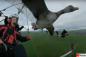 渡り鳥と一緒に空を飛び、安全な経路を指南する男性