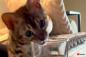 「えっ、お水?」ベンガルの子猫、コップの中に水があることに気づいてびっくりしつつ、美味しそうに飲み始める