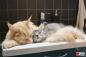 洗面台にて「最高のベッド見つけたニャ!」ゴージャスな毛に包まれて、すやすやモードのメインクーンたち