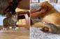 犬たちが好きすぎてしょっちゅう遊びに来る隣の家の猫、やさしく受け入れる犬たち